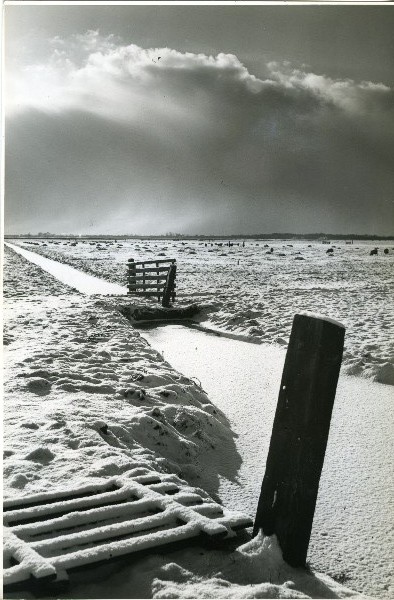 Foto in zwart-wit van een besneeuwd weidelandschap door J.D. de Jong, 1960