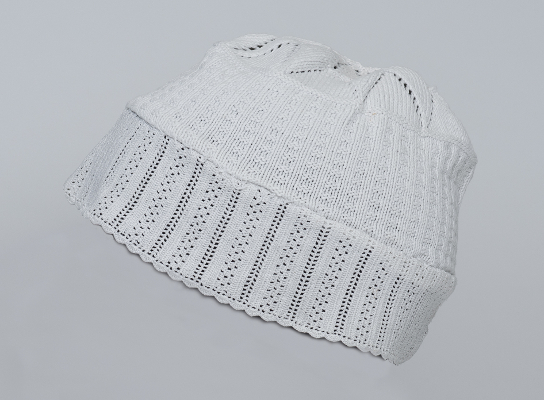 Een rond gebreide ondermuts met een gehaakte rand. De witte ondermuts was de eerste van de twee mutsen die onder het oorijzer werden gedragen. De sierstrook was in de nek zichtbaar.