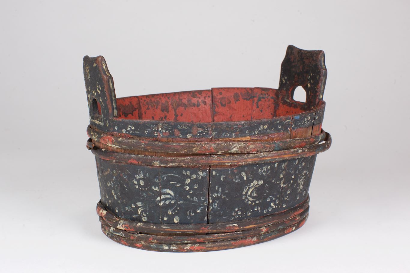 Ovalen kuip in miniatuur met twee handvatten. Witte beschildering op blauw fond. Aan de binnenkant rood geverfd.